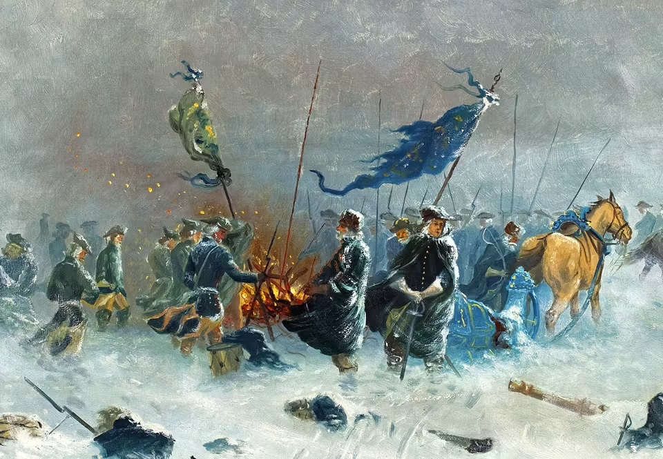 Först går fältväbel Hård, den karelske jägaren uppfödd i denna obygd, som en älg kliver han fram mellan tuvorna på myren, medan vi ständigt djunker ned. Så kommer löjtnant Löwe rak i ryggen och med en värdig hållning, en god ledare som värnar om sitt folk, men som också driver på oss i farans stund. I mitten av skaran fältskären Melchior, egentligen allt för skicklig och kunnig för den enkla sysslan och hans lille skyddsling, gossen Jonathan, föräldralös från Narva. Så följer de båda knektarna, jag själv, Rask och så Flink, blöta och genomsura inpå bara benet och min axel värker som eld av blessyren! Och sist, lite på släptåg, sjuk och eländig och haltandes, den annars så mästrande, men nu allt för klagande fältprosten Salvius.